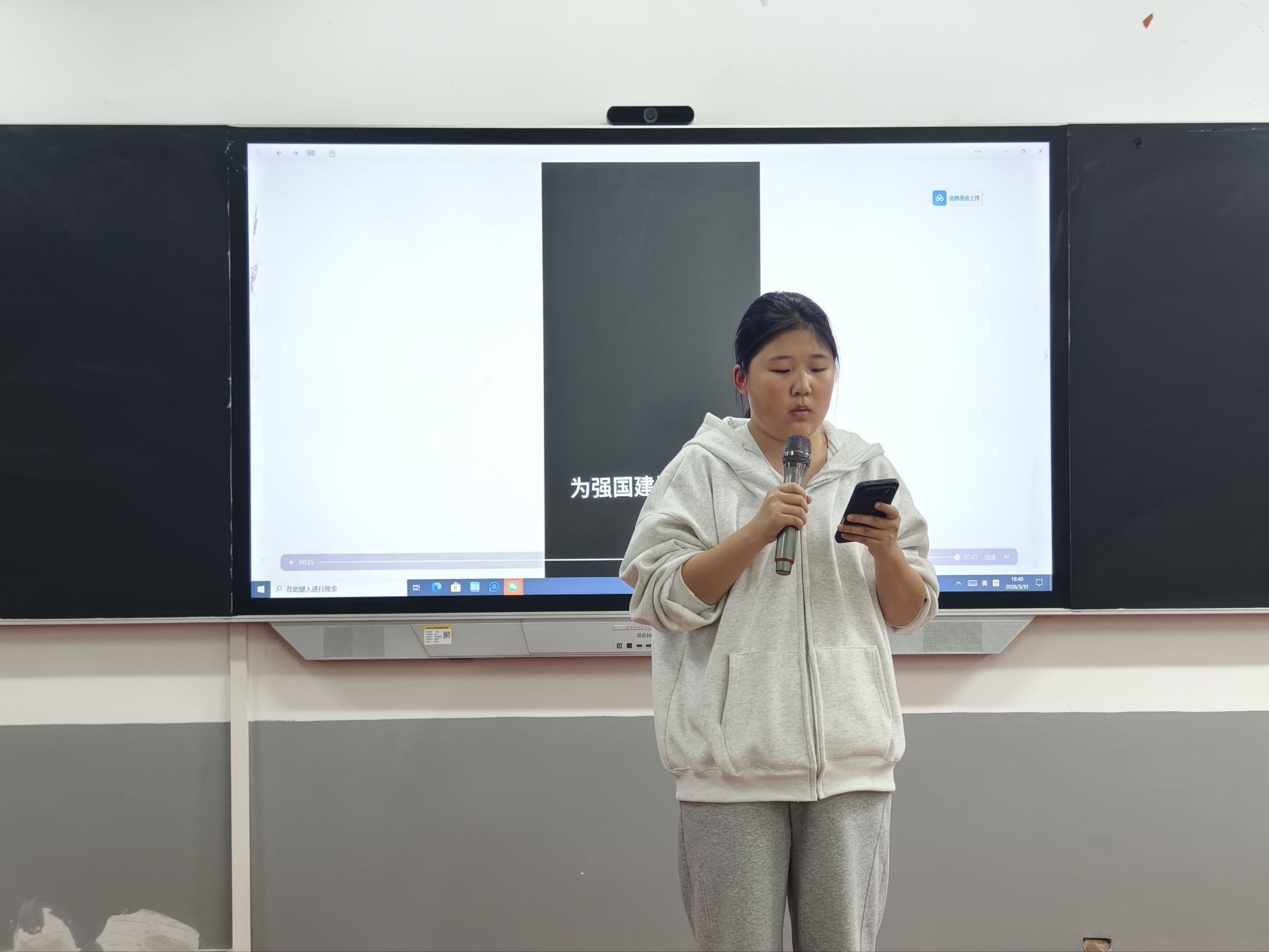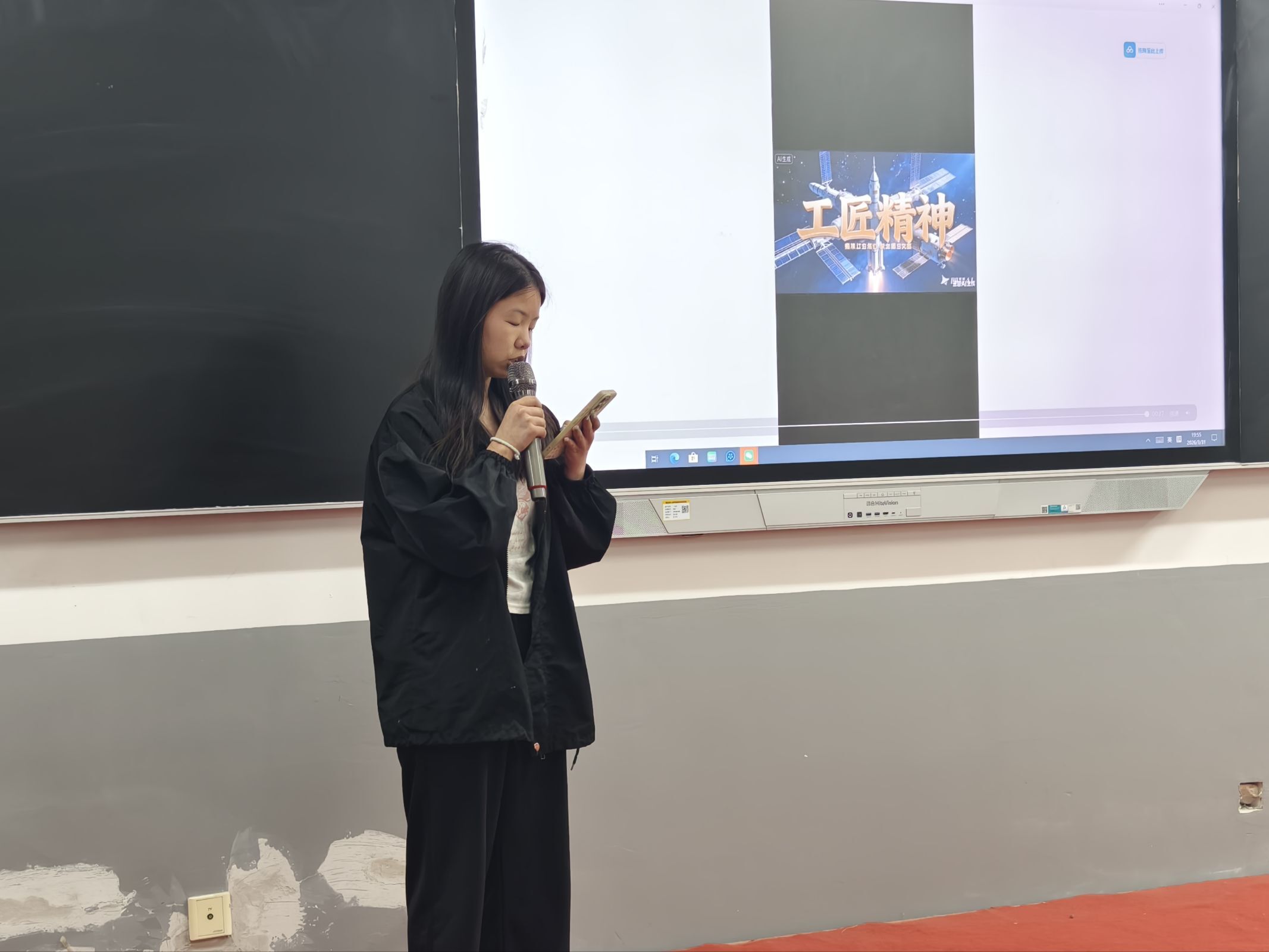 在成果展示环节,每组选派一名代表上台播放成片并讲解创作思路。从脚本构思到AI工具应用,从素材优化到剪辑技巧,同学们条理清晰地阐述了创作全过程,展现了扎实的数字素养与良好的表达沟通能力。
